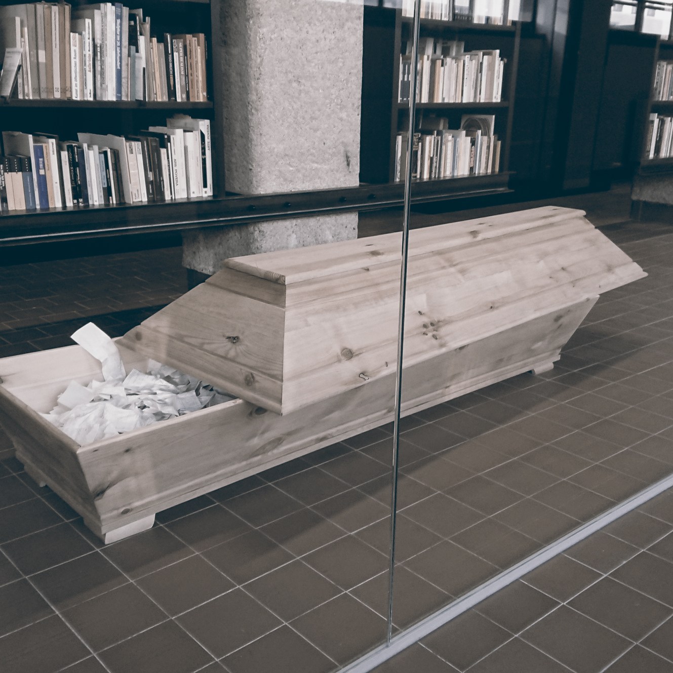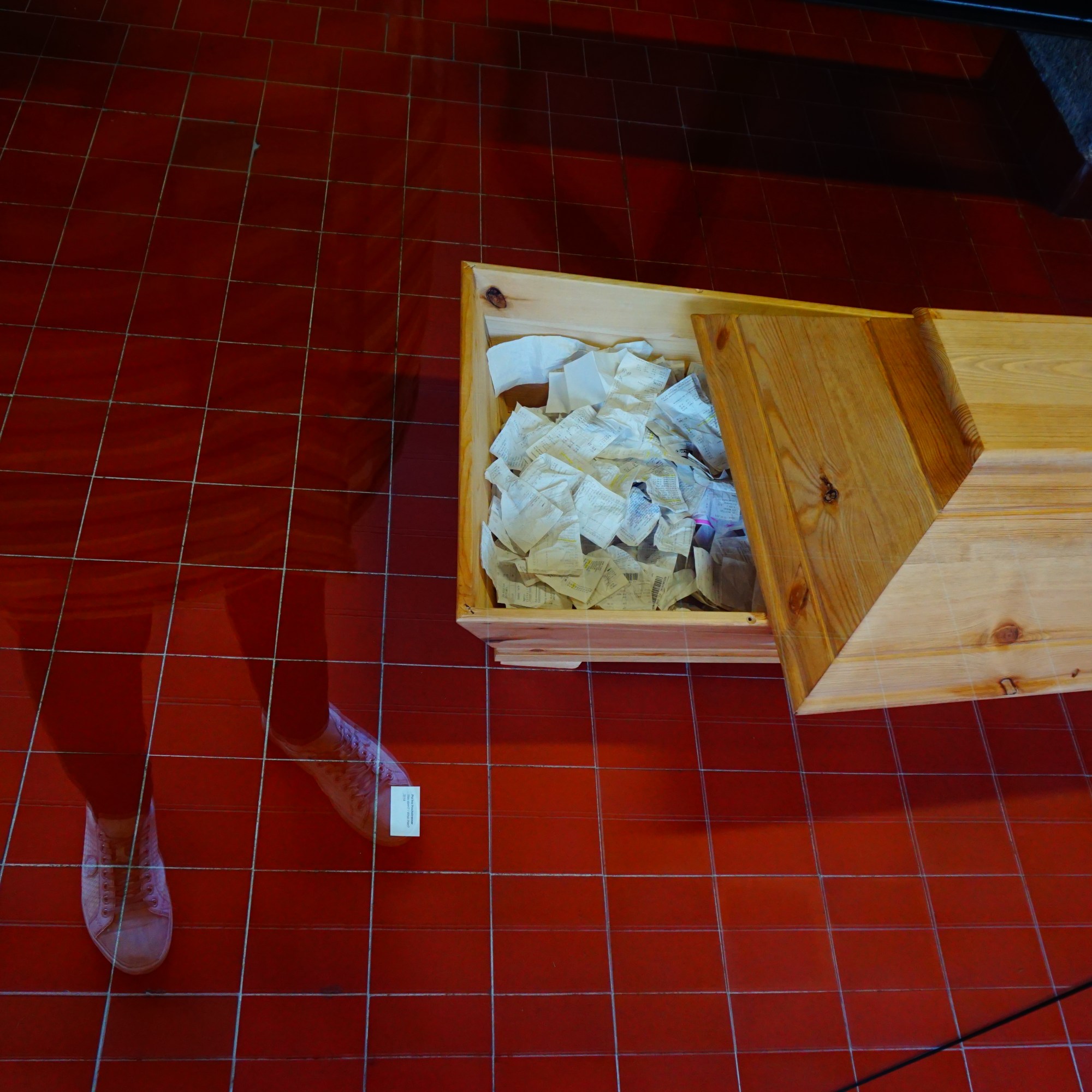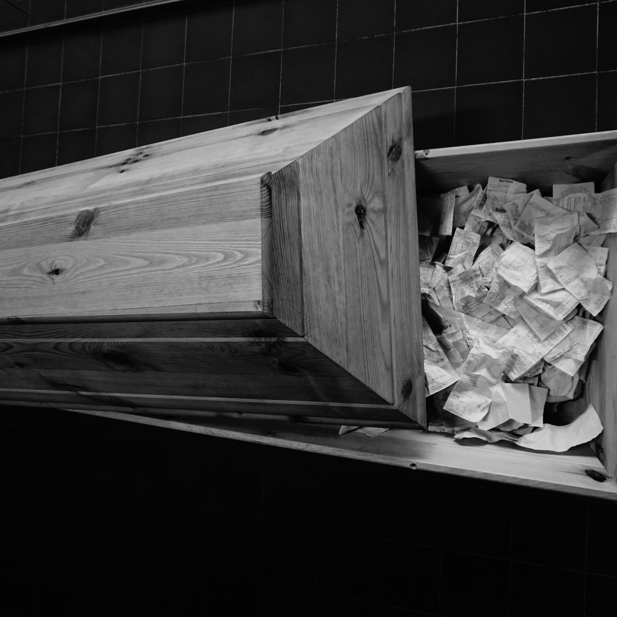 Viele unterschiedliche Rechnungen (u.a. von bekannten Filialen wie Billa, Bipa. Spar, Thalia, Gerstaecker uva.) finden sich in einem einfach gehaltenen Sarg aus Vollholz.